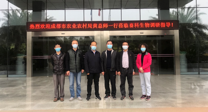 2020年4月7日由成都市農業(yè)農村局總農藝師黃挺帶隊,投資與對外合作處處長(cháng)楊澤江、余小勇調研員一行赴畜科生物工程有限公司現場(chǎng)調研指導。