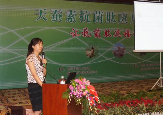 中農穎泰公司李波博士向與會(huì )代表介紹了天蠶素抗菌肽的應用技巧。天蠶素是第一個(gè)被發(fā)現的動(dòng)物抗菌肽,大量研究結果表明,天蠶素抗菌肽可以替代金霉素、桿菌肽鋅等常用飼用抗生素,并具有促進(jìn)動(dòng)物生長(cháng)、增強免疫功能,改善畜產(chǎn)品品質(zhì)、增進(jìn)人類(lèi)健康等功能。李博士對天蠶素抗菌肽在國內的研究動(dòng)向,并從其安全性、生物特性、穩定性等方面進(jìn)行闡述。還展示了在大鼠、肉雞、仔豬及水產(chǎn)上的實(shí)驗效果,并根據實(shí)驗結果提出了相應的飼喂方案。